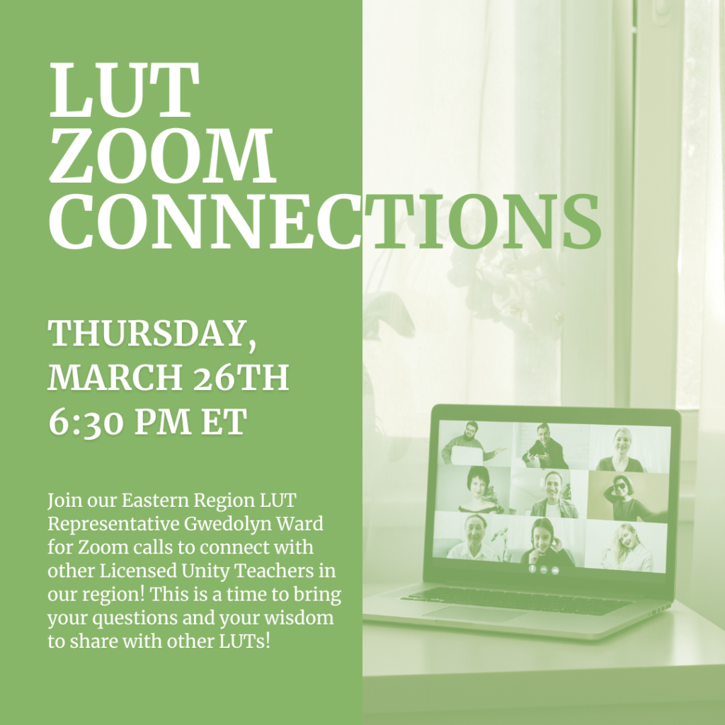 Join our Eastern Region LUT representative Amy Joslin for Zoom calls to connect with other Licensed Unity Teachers in our region! This is a time to bring your questions and your wisdom to share with other LUTs! We have some special guests joining us for some of these Zoom meetings, so mark your calendars!